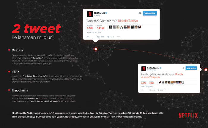 Sosyal medya platformu Youtube’a katılma tarihi 12 Eylül 2016 ve takipçi sayısı 81,553 kişi (Erişim Tarihi: 21.02.2018) olan Netflix Türkiye’nin lokal çalışmaları olan Saadettin Telsoy Hawkings’te, Ebru Originals, Dönence ve Orklar Aramızda videoları Youtube kanalı aracılığı ile diğer sosyal medya mecralarında paylaşılmıştır. İki tweetle lansman mı olur? sloganıyla (Resim 5: s.12)Twitter’da ilk söylemini gerçekleştiren marka, Kristal Elma Festivali 2017 ödüllerinde Dijital ve Sosyal Medya Kategorisi’nde, “İki Tweet Lansman” başlıklı projesiyle Sosyal Medya En Yaratıcı Gerçek Zamanlı Aksiyon dalında bronz ödüle layık görülmüştür. Markanın kullanmış olduğu sosyal medya platformlarından Twitter ile yaptığı çıkış, ilk 48 saatte %12,2’lik etkileşim oranı yaratmış ve on günde 18.000 kişinin Twitter hesabını takip etmeye başlamasını sağlamıştır. Medya bütçesi kullanılmadan yapılan tanıtım stratejisinin büyük etki yarattığını görülebilmektedir (Kristal Elma, 2017).