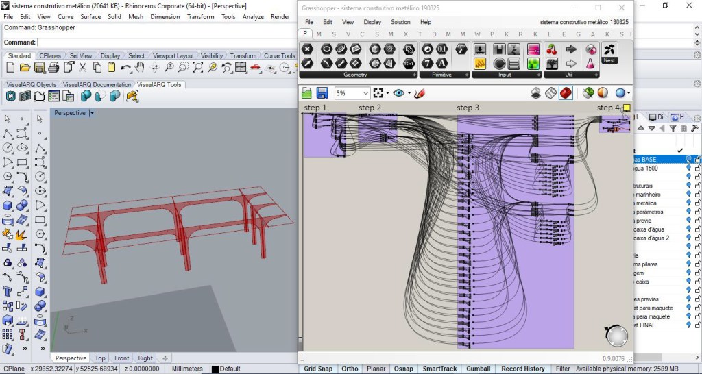 Doktora çalışmasında kapsamında, söz geçen bütünleştirme eylemi için Grasshopper® yazılımından yararlanılmıştır. Bütünleşik model, strüktürel hesaplama, mimari tanımlar ve dijital fabrikasyon sürecinin planlanması gibi bileşenleri içermektedir. Ancak tasarım eylemlerinin bütünleşik hesaplamalı bir modele dahil edilmesi için, tasarım eylemlerinin sıralı bir biçimde temsiline olanak sağlayan bir platforma/yazılıma ihtiyaç duyulmaktadır. Bir başka ifadeyle belirli bir parametrenin değiştirildiğinde, bütün modelin ve ilişkilendirilmiş bütün bilginin bu değişiklikten özyinemeli[9] bir biçimde etkilenmesi gerekmektedir. Kodlamanın sentezi aşağıdaki gibidir.