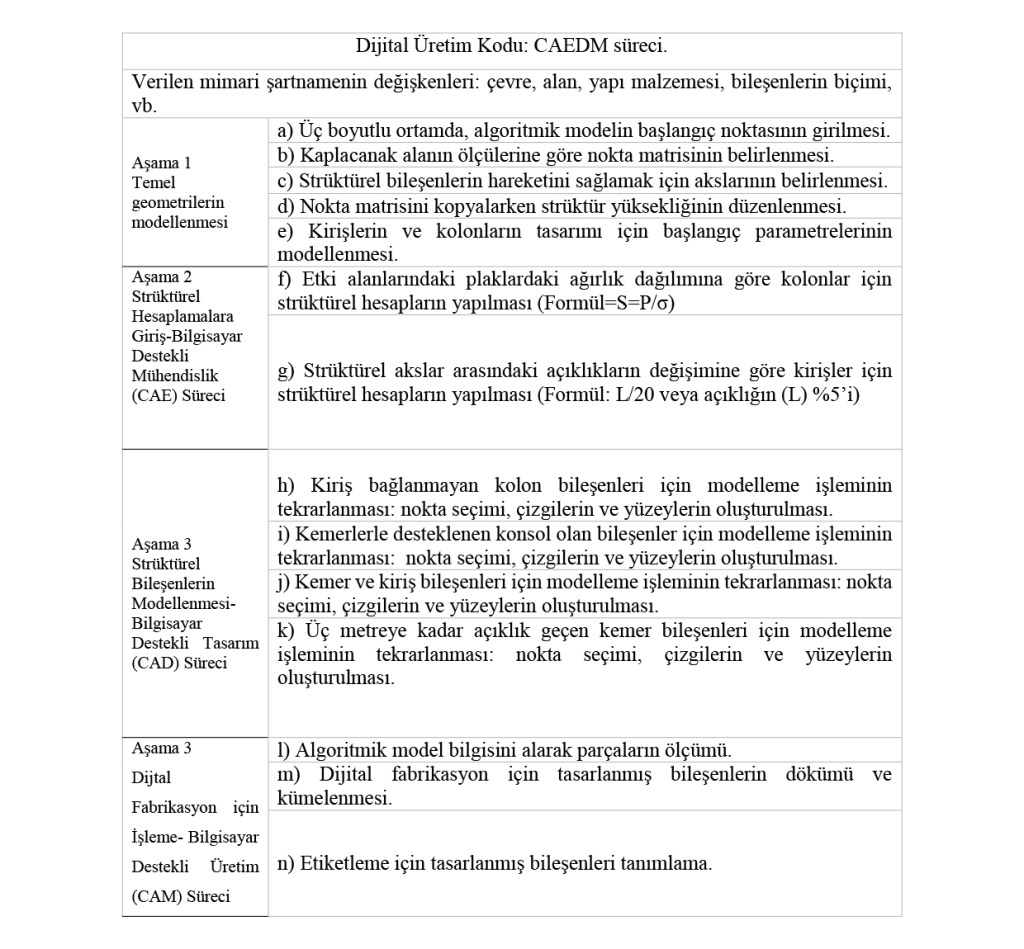 Bu yazı, 2015 ve 2019 yılları arasında mimarlık alanında yürütülen bir doktora araştırmasına genel bir bakış niteliğindedir. Çalışma, kodlama [2] süreçleri ile tasarımcının etkileşimini değerlendirmek amacıyla, mimari tasarımın yaygın bir pratiğini yeniden üreten deneysel bir aşama içermektedir. Çalışmanın sonuç ürün çelik strüktüre sahip ortak kullanımlı iki yatak odalı bir evin tasarımı ve inşası için hazırlanan dijital üretim kodudur. Sunulan kod, toplam 160m2 kapalı alana sahip bir strüktürün inşası için algoritmik bir modelleme yöntemini dijital bir üretim süreciyle ilişkilendirmektedir. Çalışmanın amacı, mimarlara için mimarlık pratiğini bilimsel prosedürlerle sadeleştirmeyi deneyebilecekleri Bilgisayar Destekli Mühendislik, Tasarım, Üretim (CAEDM) süreçleri sağlamaktır.