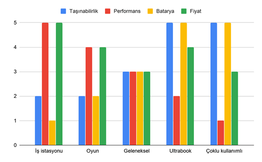 Dahili bataryası ve ekranı olması nedeniyle taşınabilirlik konusunda büyük artısı olan bilgisayarlar olmasına rağmen performans konusunda eksiklikleri vardır. İş istasyonu, oyun, geleneksel dizüstüler, ultrabook, çoklu kullanımlı notebooklar, tablet ve netbookları bu sınıfa alabiliriz. Dört alt parametre(taşınabilirlik, performans, batarya, fiyat) ile bu ürünleri değerlendirebiliriz.