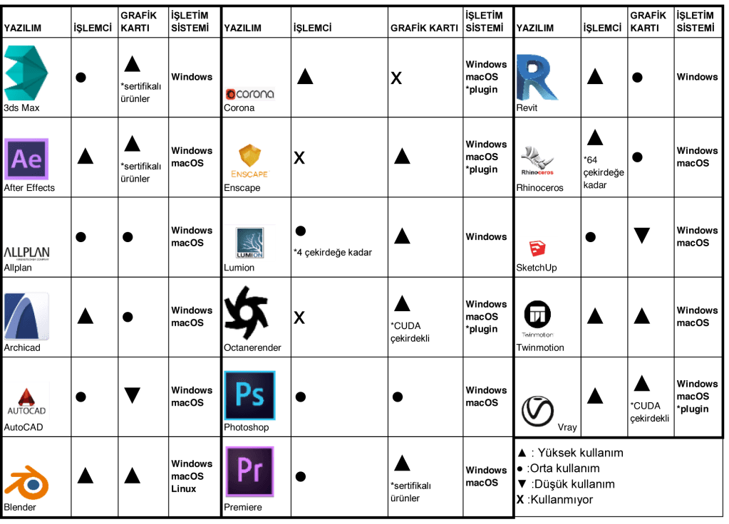 Yazılımların donanım kullanımı, tasarlanma biçimine göre farklılık gösterebilir. Yazılımlar bilgisayarların işlemci, grafik kartı veya hem işlemci hem grafik kartı gücünden yararlanabilirler. Bilgisayar seçiminde kullanılan programların donanım ihtiyaçları göz önünde bulundurulmalıdır. Bu kısımda yazıda söz edilen yazılımlar ve bazı ek yazılımların donanım kullanımı ele alınmıştır (Tablo 3).