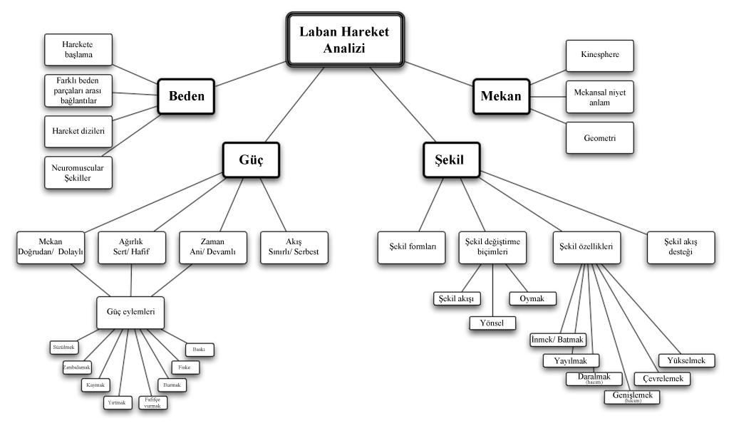 İlerleyen süreçte, dans performansından hareket verisinin elde edilmesi ve analizi üzerinde araştırmamı devam ettirdim. Ayrıca dans verisinin sayısal ortamda analizine yönelik ön çalışmaları inceledim. Literatür araştırmalarımda dans disiplininde en çok kullanılan notasyon sistemlerinden biri olan Laban Hareket Analiz teorisi ile tanıştım (Şekil 1). Laban Hareket Analiz teorisi projenin ilerleyen aşamalarında, hareket analizinde seçtiğim parametrelerde önemli bir kaynak niteliği oluşturdu.