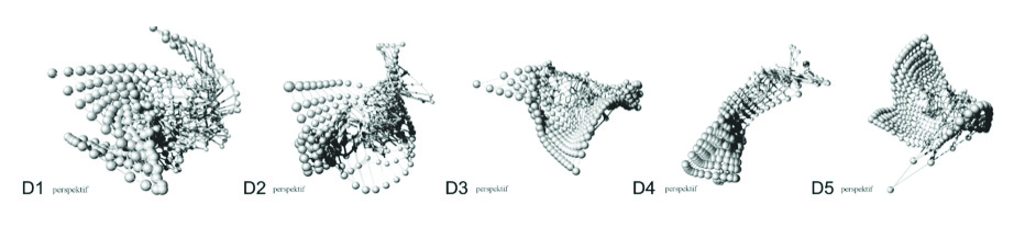 Eğri üzerinde belirlenen noktalar ile, yüzey bölünmesi ile elde edilen noktalar arasındaki mesafeye göre en yüksek ve en düşük değerleri buldum; kürelerin yarıçapları bu veriler ile ifade ettim. Böylece, eğriye en yakın yüzey noktasındaki kürenin yarıçapı en küçük olurken, eğriden uzaklaştıkça kürelerin yarıçapları, belirlenen en yüksek değere kadar büyüyebildi, sonrasında sabit kaldı. Oluşturulan dijital model, üzerindeki kürelerle beraber etkileşimli bir yüzey, bir kabuk olarak düşünüldüğünde hareket eğrisi de hareket halinde olan dansçıyı temsil etmekte. Bu modeli altlık olarak ele alarak, hareketlerle biçimlenen bir kabuğun dansçı ile etkileşimi, bu yüzey ile dansçı arasındaki mesafenin azaldığı durumlarda kürelerin yarıçaplarının küçülmesi, önceki durumuna göre daha açık ve geçirgen bir yüzey oluşturması, mesafenin artması ile kürelerin yarı çaplarının tekrar büyümesi gibi denemeler yapıldı. Her bir küreye bağlanan hareket sensörleri küre yarıçaplarında değişim gerçekleştirmekte. Küreleri içleri gaz dolu birer balon olarak düşündüğümüzde, hareket yoğunluğundaki değişime göre kürenin bağlı olduğu kollektör sayesinde kürenin içindeki gaz miktarı değişebilmekte. Böylece tasarlanan yüzey, hareket değişimlerine eş zamanlı olarak tepki verip formunu yeniden şekillenebiliyor. Tasarımın ilk aşamasında form arama çalışmalarında kullanılan hareket verileri sonraki aşamada formun etkileşime bağlı değişim aşamasında da kullanılmakta ve hareketten ortaya çıkarılan form tekrar hareket ile etkileşime girip şekil değiştirmekte. Şekil 8, etkileşimli modelin sabit bir anlık durumunun model olarak ifadesini gösteriyor. Şekil 9 ise tüm dansçılar için oluşturulmuş olan etkileşimli modelin sabit anlık durumları perspektif olarak görülmekte.