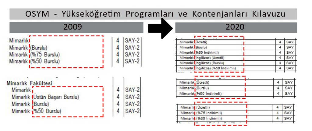 Mimarlık bölümünde öğrenci kabul eden üniversitelerin sayısal artışının ötesinde, öğrenci kontenjanlarının ifadesinde söylem düzeyinde de yapısal değişiklikleri gözlemlemek mümkündür. Örneğin on yıl öncesindeki vakıf üniversitesi kontenjanlarında ücretli bölümler için ayrı bir ifade kullanılmazken, “burslu”, “%50 burslu”, “üstün başarı burslu” gibi ifadeler bulunmaktayken günümüzdeki yüksek öğretim kılavuzlarında “ücretli”, “%75 indirimli”, “%50 indirimli”, “%25 indirimli” gibi ifadelere rastlamaktayız (Şekil 3; Şekil 4).
