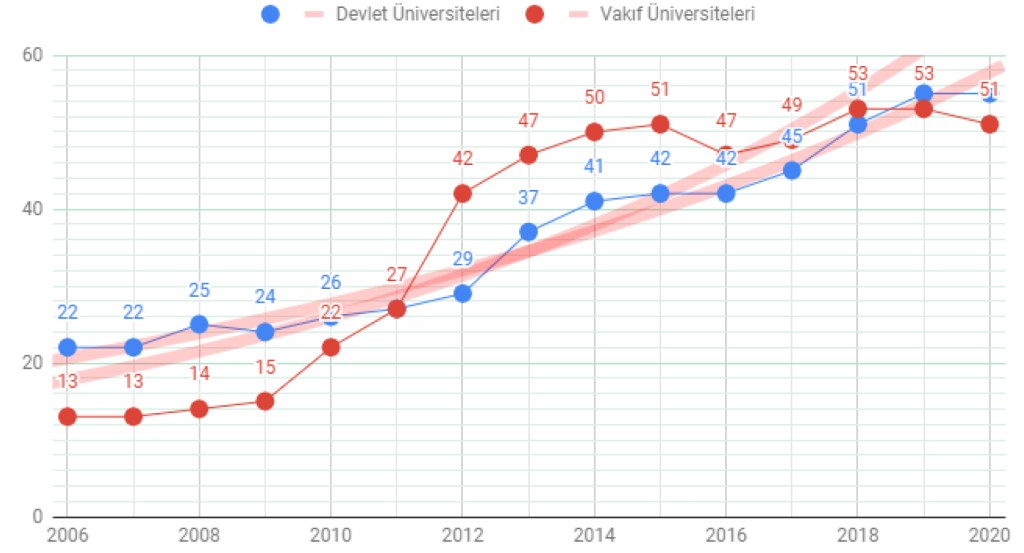 [4] Şekil 1 ve Şekil 2’de kullanılan verinin tamamı “osym.gov.tr” adresinden yararlanılarak derlenmiştir. Grafikte üniversitelerin ilan ettikleri kontenjanlar esas alınmıştır. Şekil 1’de toplam üniversite sayısı hesaplanırken, bir üniversitede aynı bölümün Türkçe ve İngilizce programları ya da ikincil öğretim programı olması durumunda bunlardan yalnızca bir tanesi hesaplamaya katılmıştır.