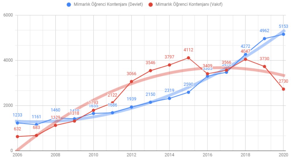 Üniversitelerin kabul ettikleri öğrenci kontenjanlarında ise benzer bir artışı görmekteyiz. 2006 yılında ilan edilen Mimarlık öğrencisi kontenjanı toplamda 1865 iken, 2020 yılına gelindiğinde bu sayı dört katından fazla bir artışla 7883’e yükselmiştir (Şekil 2). Bu durumun meslek pratiğinde bir tıkanma yaratacağını ve hatta bu tıkanmanın kendisini çoktan hissettirmeye başladığını söylemek gerekiyor.