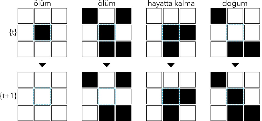 Doğum: {t} anında ölü hücrenin tam olarak üç canlı komşusu varsa, {t+1}’de o hücre canlı hale gelir yani doğar.