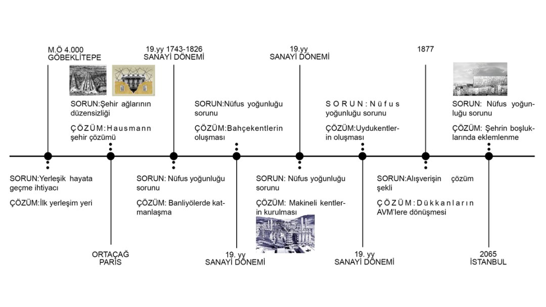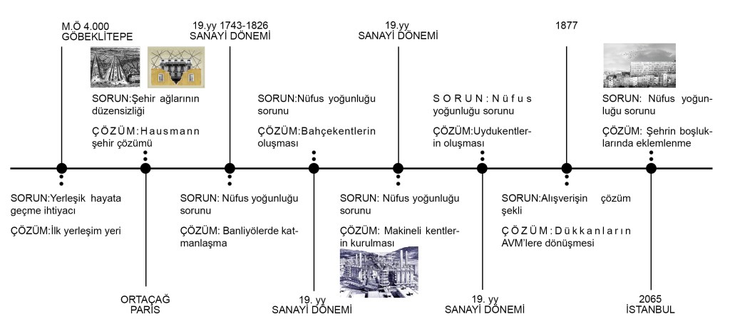 Mimarlık tarihinin değişimi o tarihte yapılan kent düzenleriyle oluşturulmuştur (Görsel 1). Görsel 1’de anlatıldığı gibi ortaçağda sorun yerleşik hayat, şehir ağlarının düzensizliği gibi konular iken 19. yüzyıldan sonra nüfus yoğunluğu tekrar eden bir sorun haline gelmiştir. Bu bağlamda, var olan soruna bir çözüm bulmak yerine mevcut sorunların üzerine yeni sorunların eklemlendiğinden söz edilebilir.