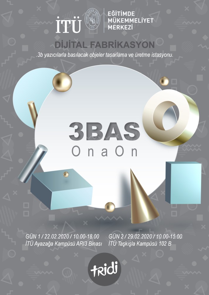 İTÜ Mükemmeliyet Merkezi bünyesinde Dijital Fabrikasyon İstasyonlarından biri olarak düzenlenen 3Bas OnaOn Atölyesi, 3 boyutu yazıcılarla basılacak objeleri tasarlamaya ve üretmeye odaklanmıştır. Asena Kumsal Şen, Sema Alaçam, Ekin Ünlü ve İnanç Şencan yürütücülüğünde, 3 boyutlu yazıcı ile obje üretimi konusunda deneyim kazanmak isteyen, tüm üniversitelerin lisans ve lisansüstü öğrencilerinin katılımına açık olarak 2 günlük bir atölye olarak kurgulanmıştır. 3Bas OnaOn Atölyesi, Maltepe, Gebze Teknik ve İstanbul Üniversitesi’nden 10 öğrencinin katımıyla 22 Şubat 2020 tarihinde 10.0-18.00 saatleri arasında İTÜ Ayazağa Kampüsü ARI-4 Binası’nda yer alan Tridi Atölye‘de, 29 Şubat 2020 10.00-15.00 saatleri arasında İTÜ Taşkışla Kampüsü 102 nolu İnnovasyon ve Modelleme Laboratuvarı’nda (İMLab) gerçekleştirilmiştir.