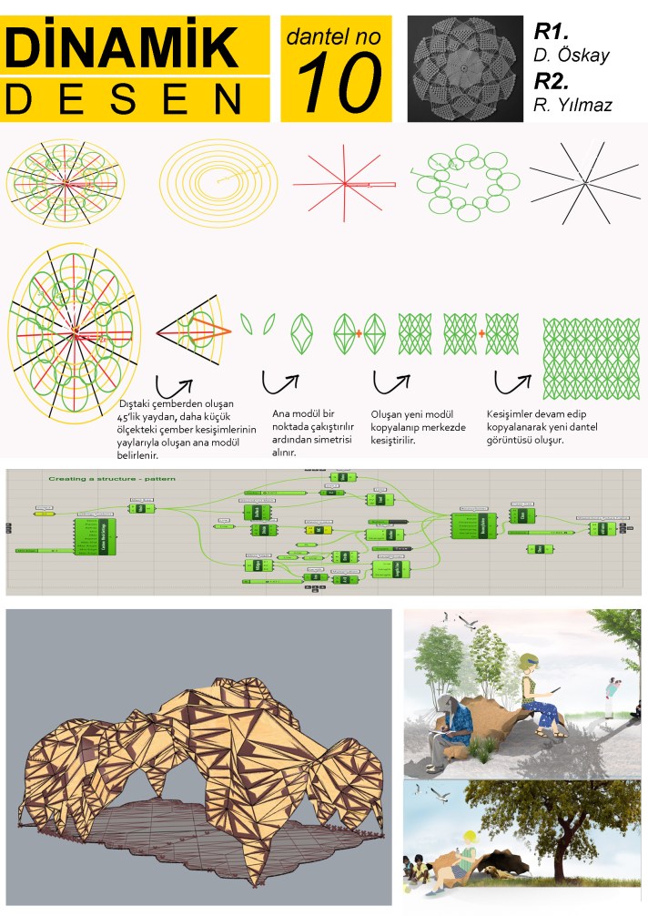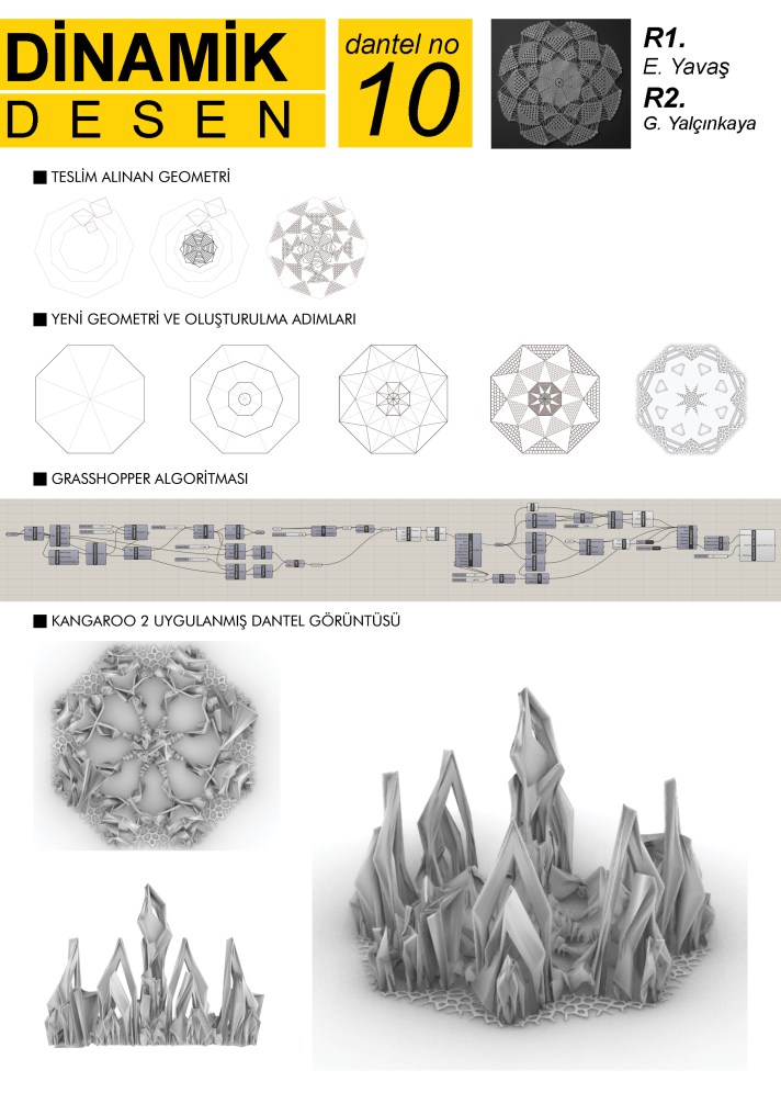 Atölye kapsamında ilk etapta bilgisayar kullanılmadan 2 boyutlu dantel örüntüleri eskiz yaparak çözümlenmiş, geometriyi oluşturma kural, yöntem ve yaklaşımları ortaya konulmuştur. Daha sonra, her katılımcı bir başkası tarafından oluşturulan eskiz/kural seti üzerinden 2 boyutlu kompozisyonlar oluşturmuştur. Elde edilen 2 boyutlu örüntülerin 3 boyutlu formlara dönüştürülmesi için dinamik geometrileri fizik kurallarını göz önünde bulundurarak oluşturabilen Kangaroo 2 eklentisinin eğitimi yapılmıştır. Temel Kangaroo 2 bilgisinin ardından danteli 3 boyutlu formlara dönüştüren “grasshopper tanımı” katılımcılarla birlikte kurgulanmıştır. “Tanımın” parametrik yapısı sayesinde aynı tanım kullanılarak kullanıcıların parametreleri değiştirmesi ve tasarım kararlarını yönlendirmesiyle her katılımcı kendi özgün formunu oluşturmuştur.