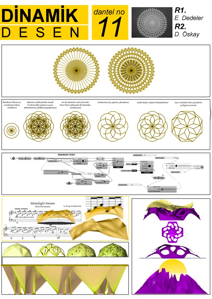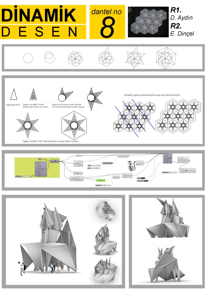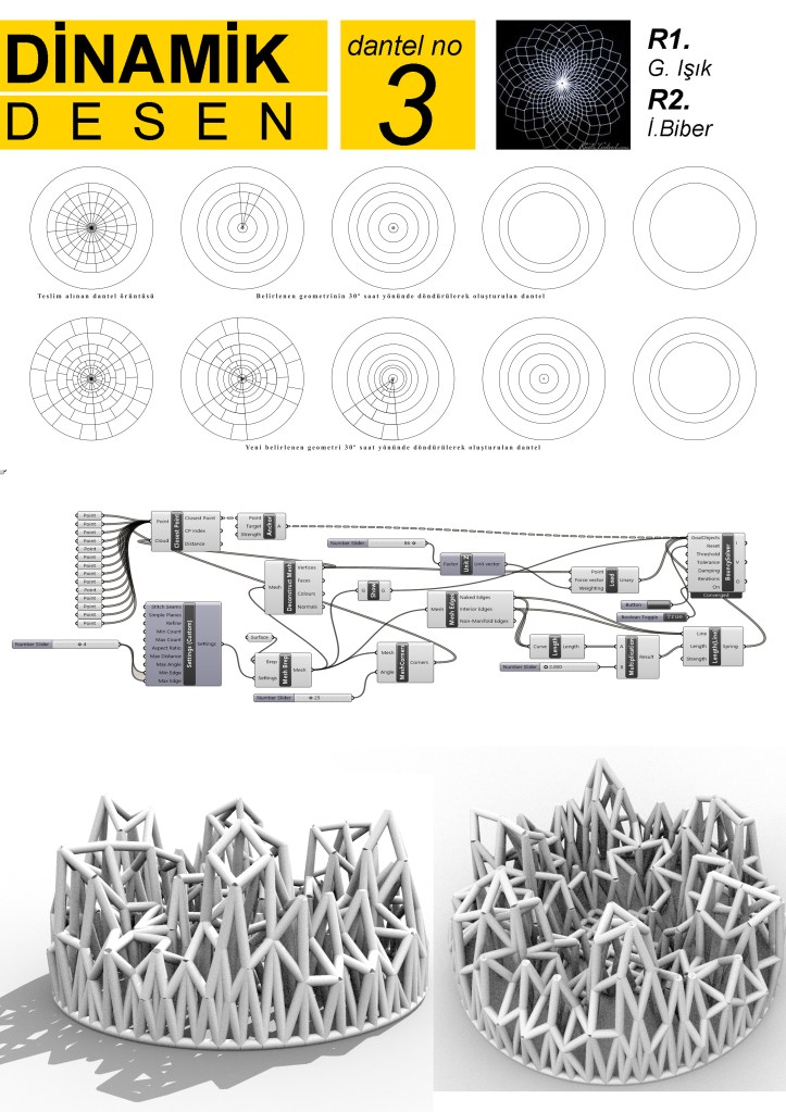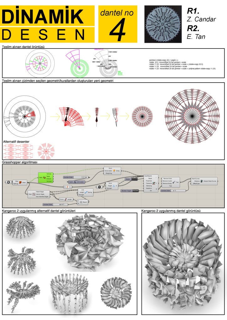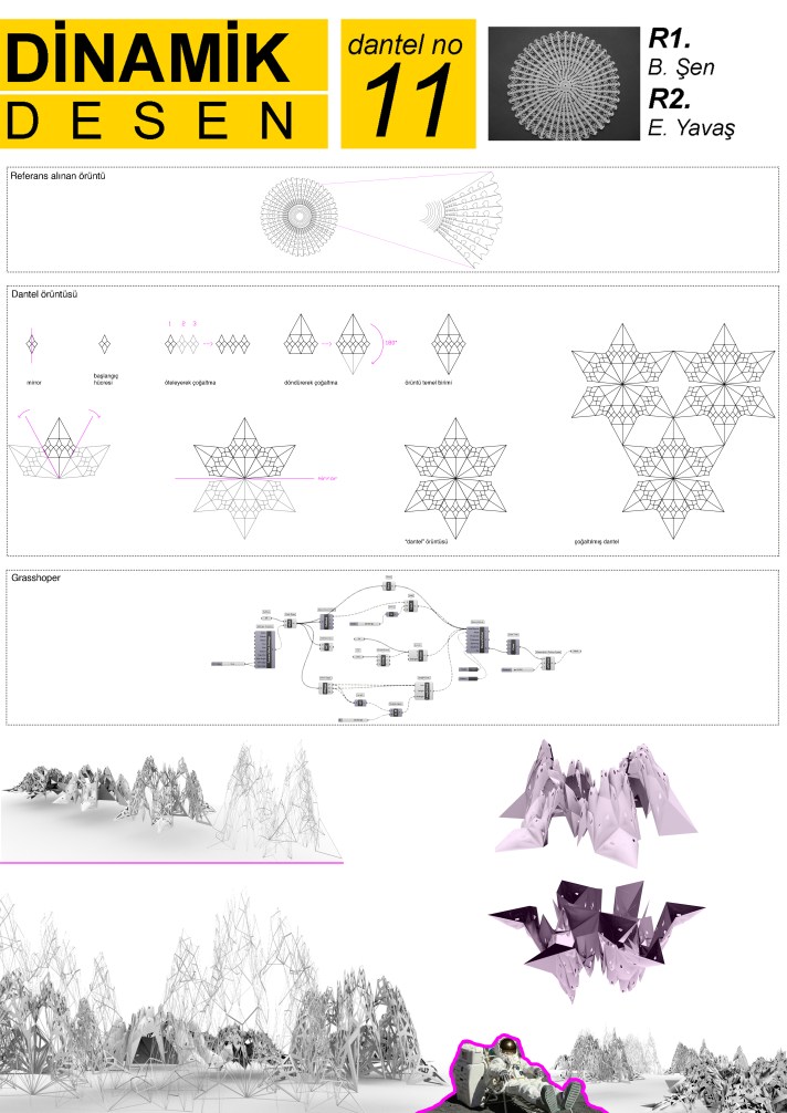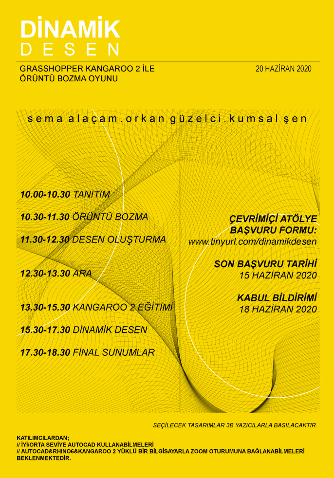 Dinamik Desen, Rhino/Grasshopper platformunda Kangaroo 2 eklentisini kullanarak 3 boyutlu biçim bulma simülasyonlarının anlatımına odaklanmış, geleneksel danteller temsillerinden yola çıkarak 2 boyutlu geometrik örüntülerin 3 boyutlu formlara dönüştürülmesini hedeflemiştir. Asena Kumsal Şen, Orkan Güzelci ve Sema Alaçam yürütücülüğünde çevrimiçi olarak, 20 Haziran 2020 tarihinde saat 10:00 ile 18:30 arasında gerçekleştirilen atölyede 22 katılımcı 15 farklı dantel örüntüsünün 3 boyutlu biçim bulma araştırmasını tamamlamıştır.