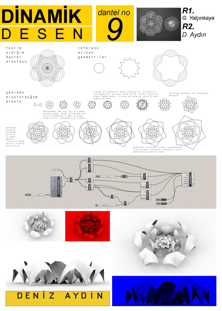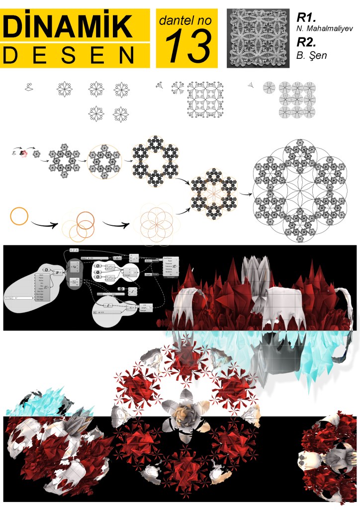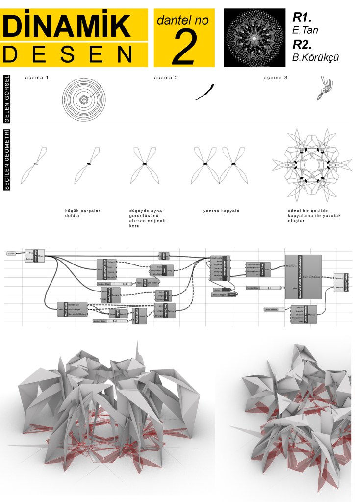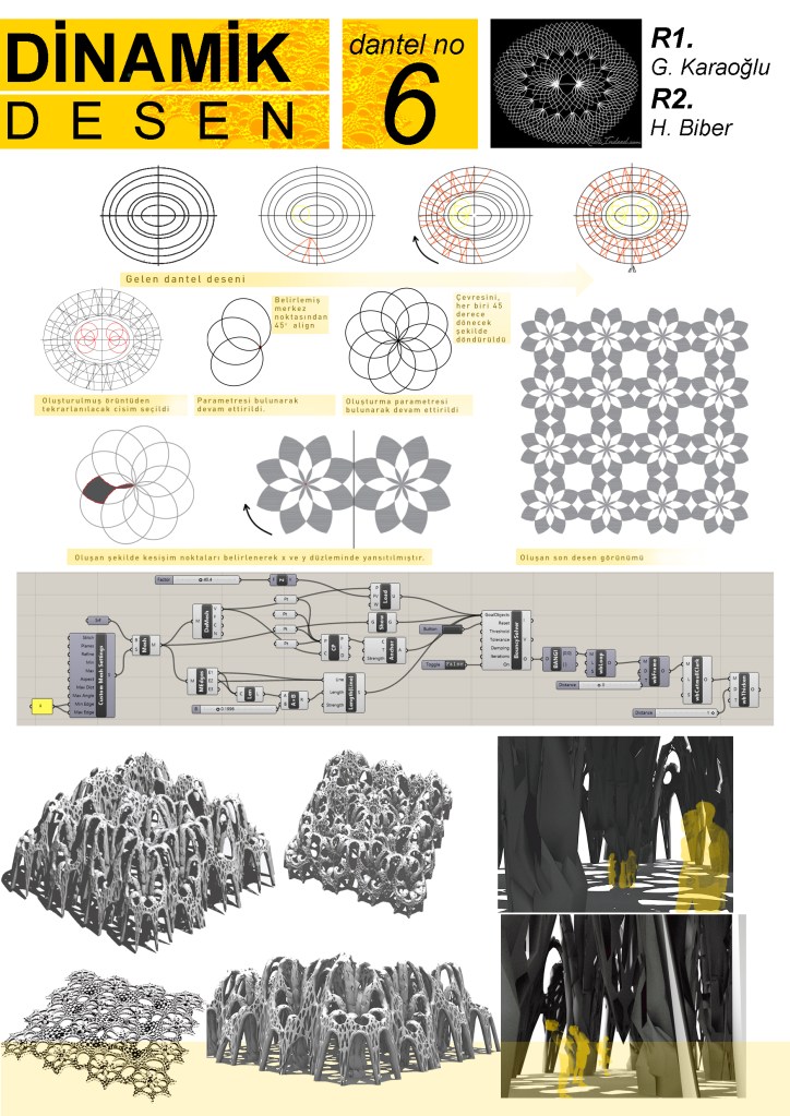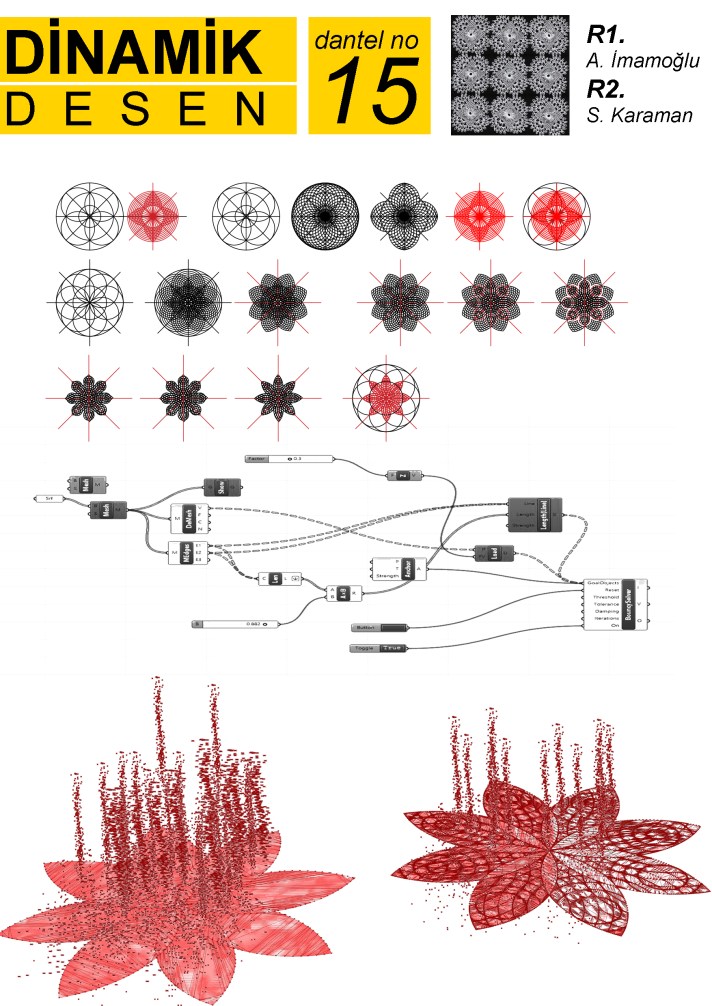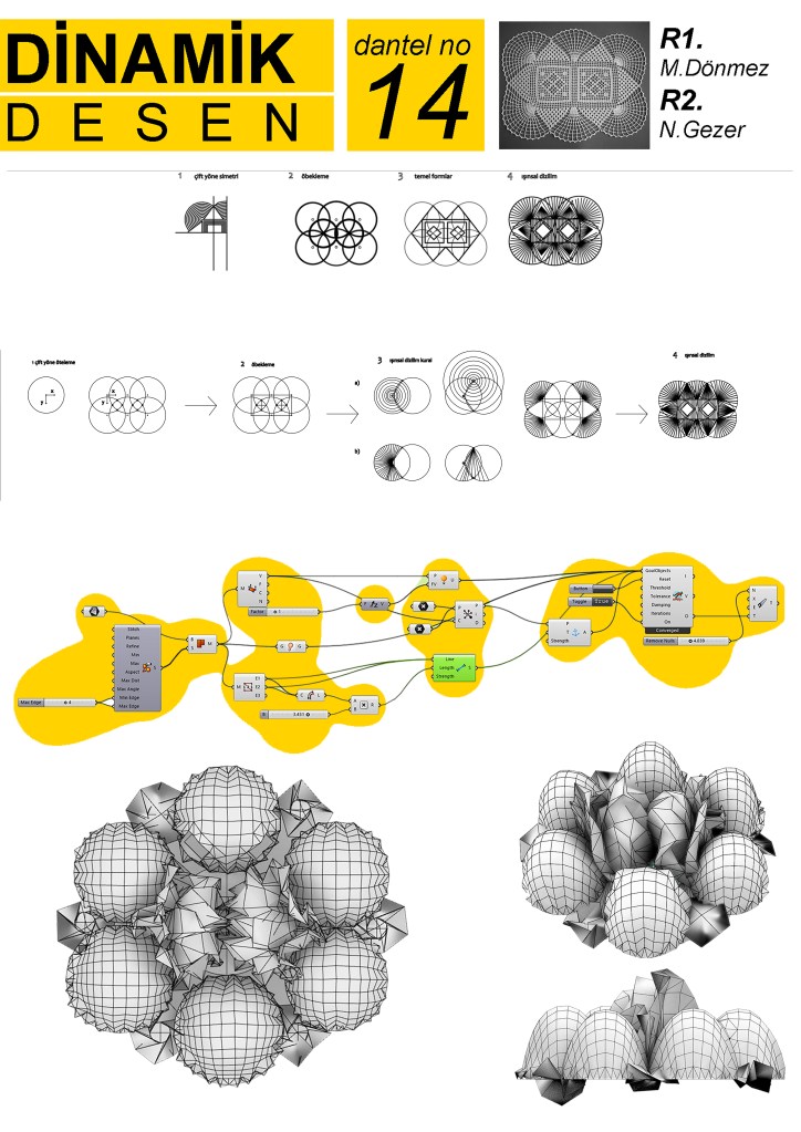 Dinamik Desen, Rhino/Grasshopper platformunda Kangaroo 2 eklentisini kullanarak 3 boyutlu biçim bulma simülasyonlarının anlatımına odaklanmış, geleneksel danteller temsillerinden yola çıkarak 2 boyutlu geometrik örüntülerin 3 boyutlu formlara dönüştürülmesini hedeflemiştir. Asena Kumsal Şen, Orkan Güzelci ve Sema Alaçam yürütücülüğünde çevrimiçi olarak, 20 Haziran 2020 tarihinde saat 10:00 ile 18:30 arasında gerçekleştirilen atölyede 22 katılımcı 15 farklı dantel örüntüsünün 3 boyutlu biçim bulma araştırmasını tamamlamıştır.