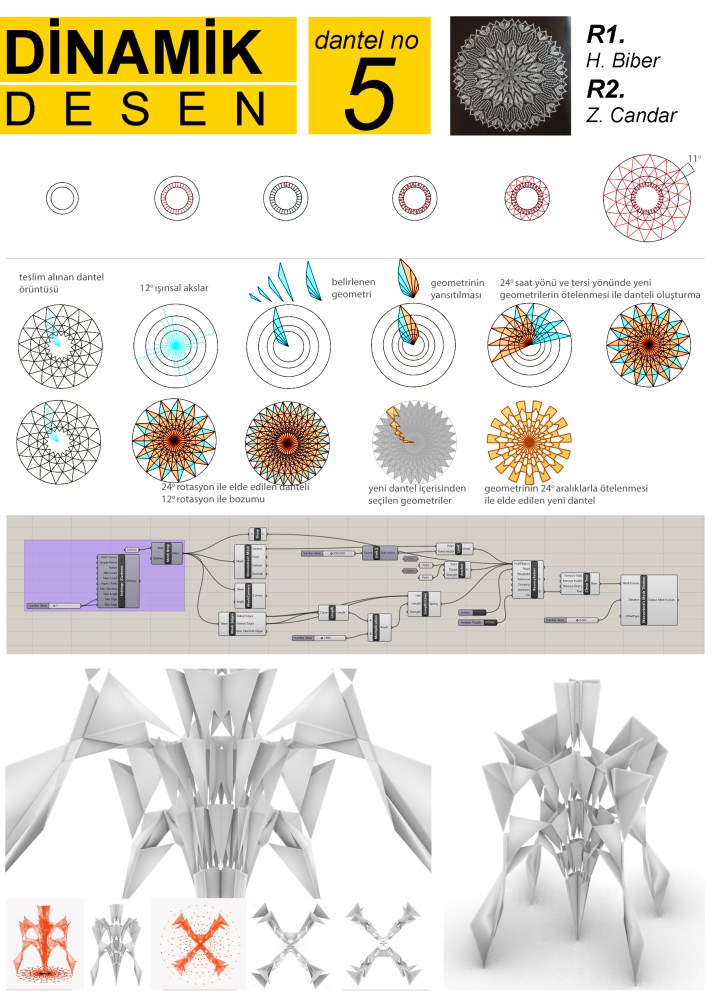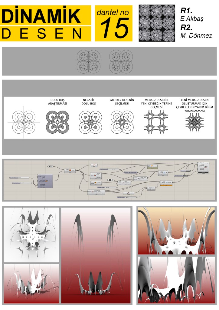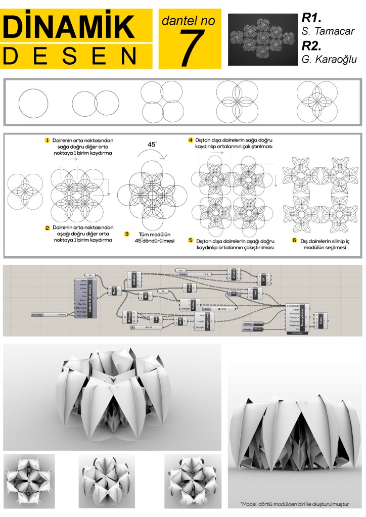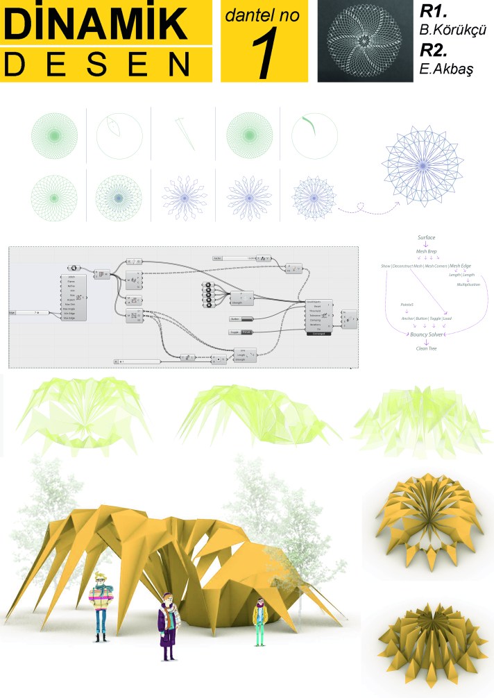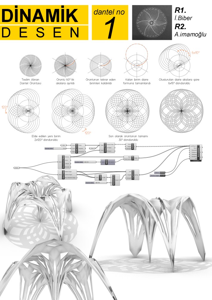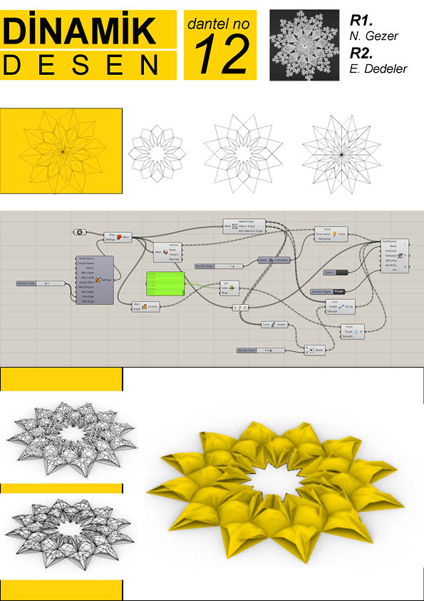 Dinamik Desen, Rhino/Grasshopper platformunda Kangaroo 2 eklentisini kullanarak 3 boyutlu biçim bulma simülasyonlarının anlatımına odaklanmış, geleneksel danteller temsillerinden yola çıkarak 2 boyutlu geometrik örüntülerin 3 boyutlu formlara dönüştürülmesini hedeflemiştir. Asena Kumsal Şen, Orkan Güzelci ve Sema Alaçam yürütücülüğünde çevrimiçi olarak, 20 Haziran 2020 tarihinde saat 10:00 ile 18:30 arasında gerçekleştirilen atölyede 22 katılımcı 15 farklı dantel örüntüsünün 3 boyutlu biçim bulma araştırmasını tamamlamıştır.