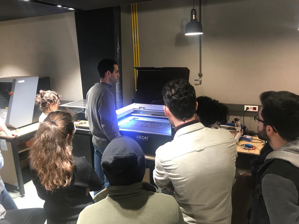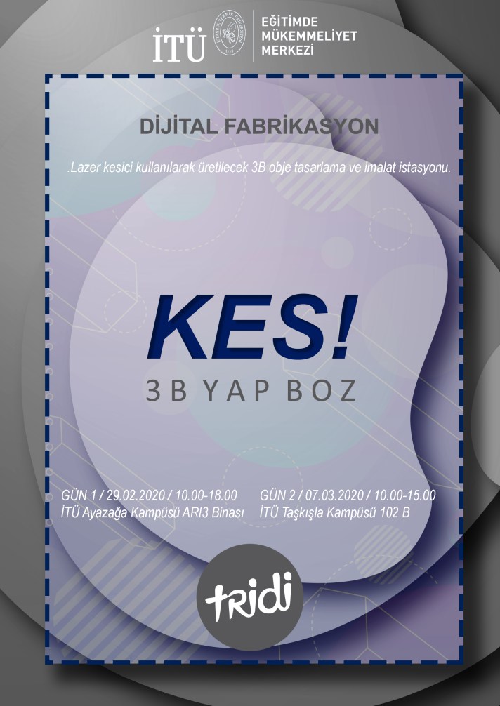 İTÜ Mükemmeliyet Merkezi bünyesinde Dijital Fabrikasyon İstasyonlarından biri olarak düzenlenen KES! atölyesi, Lazer kesici kullanarak 3 boyutlu obje tasarımı ve üretimine odaklanmıştır. Asena Kumsal Şen, Sema Alaçam, Ekin Ünlü ve İnanç Şencan yürütücülüğünde, lazer kesim ile obje üretimi konusunda deneyim kazanmak isteyen, tüm üniversitelerden lisans ve lisansüstü öğrencilerinin katılımına açık olarak 2 günlük bir atölye olarak kurgulanmıştır. KES! Atölyesi, 11 kişinin katılımıyla 29 Şubat 2020 tarihinde 10.0-18.00 saatleri arasında İTÜ Ayazağa Kampüsü ARI-4 Binası’nda yer alan Tiridi Atölye‘de, 7 Mart 2020 10.00-15.00 saatleri arasında İTÜ Taşkışla Kampüsü 102 nolu İnnovasyon ve Modelleme Laboratuvarı’nda (İMLab) gerçekleştirilmiştir. Atölyenin başlangıcında katılımcılara CNC ve lazer kesim teknolojileri ve bu teknolojilerle üretilecek objelerin tasarımı ve üretiminde dikkat edilmesi gereken konular hakkında Tridi (İTÜ Magnet Fab Lab) uzmanlarından Emre Turam tarafından bir sunum yapılmış ve lazer kesim makinalarının çalışması yerinde gözlemle desteklenmiştir. Atölyede katılımcılar maksimum 25x25x25cm’lik bir hacim içine sığacak biçimde seçtikleri 3 boyutlu nesneleri modelleyerek lazer kesici ile basıma hazır hale getirdiler.